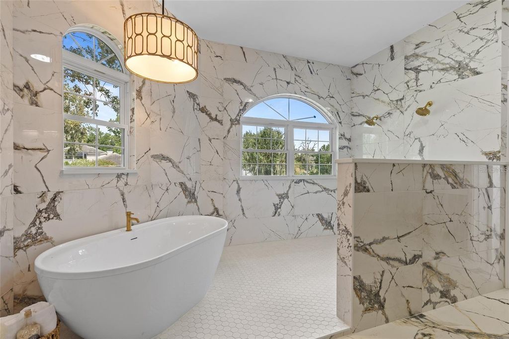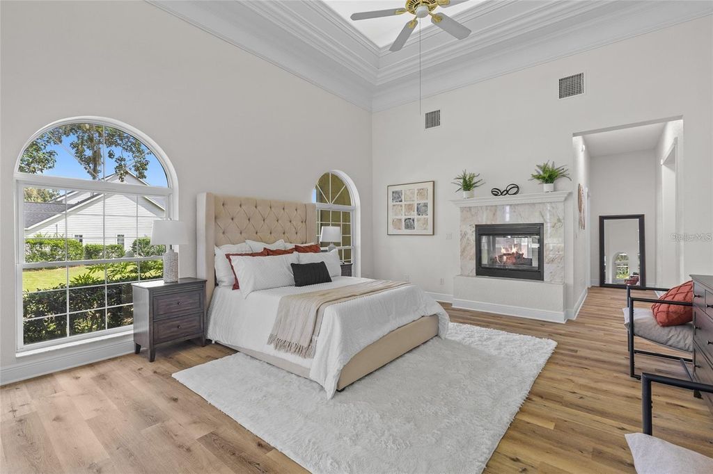 Welcome to this stunning, fully renovated luxury residence situated on a spacious one-acre lot within the exclusive, guard-gated Country Club of Ocala. This exquisite five-bedroom pool home boasts breathtaking views of the immaculate golf course, seamlessly blending classic charm with contemporary enhancements for an unparalleled living experience. Step inside to be captivated by the impressive eighteen-foot ceilings and the generous natural light that pours in through the magnificent arched windows. The open-concept kitchen is truly a chef's paradise, showcasing high-end stainless-steel appliances that blend style with functionality. The centerpiece is a professional-grade gas range, complete with a sleek hood that adds a modern touch. Custom cabinetry, designed for soft-close convenience, offers ample storage while exuding elegance. The generously sized center island serves as both a prep area and a gathering spot, seamlessly connected to a charming dining area that boasts picturesque views of the sparkling pool outside. The kitchen effortlessly transitions into the expansive living area, featuring a stunning gas fireplace that reaches from floor to ceiling, serving as a captivating centerpiece. The primary suite is a luxurious retreat, complete with soaring ceilings, elegant crown molding, a cozy private fireplace, and direct access to the pool. Adjacent to the kitchen, you'll find a spacious butler's pantry that enhances the kitchen's functionality, alongside a well-appointed laundry room. This practical space is equipped with extra cabinetry for even more storage solutions, a handy utility sink, and a washer and dryer that are included with the home, making laundry day a breeze. The master bathroom is a lavish escape, offering over 380 square feet of opulent amenities, including floor-to-ceiling tile work, a relaxing soaking tub, dual vanities, and a dual-headed walk-in shower, all crowned by a fireplace that enhances the spa-like experience. A generous walk-in closet with custom shelving completes the owner's wing. Each additional bedroom and bathroom has been tastefully remodeled with designer touches, ensuring comfort and style throughout the home. Outside, the screened-in pool and spa provide a serene oasis, perfect for entertaining while enjoying beautiful views of the golf course. With a brand-new roof installed in 2023, this home combines worry-free living with modern elegance in one of Ocala's most desirable neighborhoods. This property exemplifies the ultimate in Country Club living, offering elegant interiors and a resort-style outdoor experience"”a unique chance for those seeking an elevated lifestyle on the golf course.