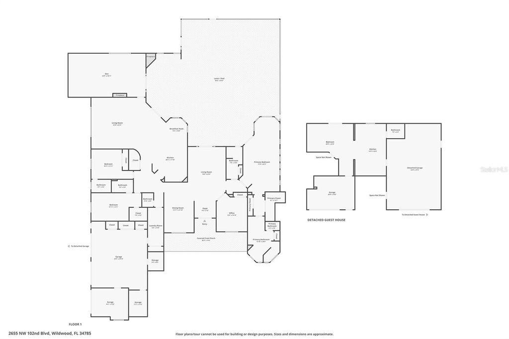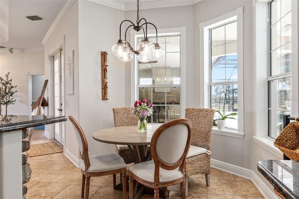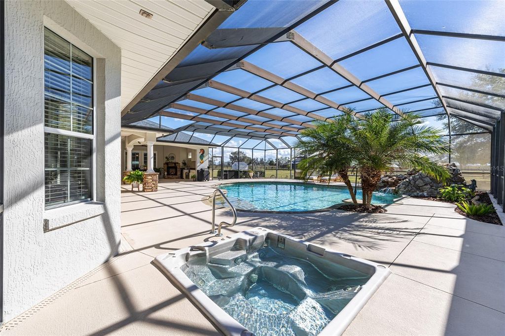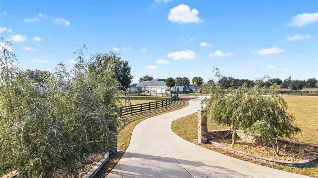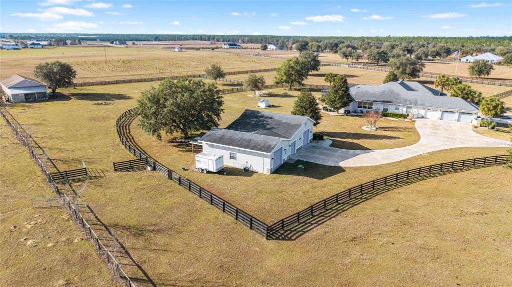 Welcome to this distinguished estate in the exclusive community of Equine Acres. Set on ten fully fenced and cross-fenced acres in Wildwood, just south of Ocala and moments from The Villages, this property offers a refined blend of luxury, privacy and functionality for both horse enthusiasts and those seeking an expansive country retreat. With two separate residences on the property, it is quite versatile. A stone-columned circular drive introduces the stately residence, which spans 4,829 square feet under air. Double doors open to a grand foyer and an airy floor plan designed for comfortable living and elegant entertaining. Beyond the entry, a wall of French doors frames serene views of the resort-style outdoor living area. Finishes include hardwood and tile floors, soaring ceilings with crown molding, and icynene foam insulation in both walls and ceilings for efficiency. Surround sound is integrated throughout. The well-appointed chef's kitchen is equipped with stainless steel appliances, granite countertops, custom solid-wood cabinetry with a matching range hood, double wall ovens, warming drawer, a walk-in pantry, and a breakfast bar overlooking the family room. A stone gas fireplace anchors the family gathering space, while the adjacent breakfast nook invites morning sunlight and views of the pool. The owner's suite provides a private sanctuary with lanai access, sitting area, dual walk-in closets, and a spa-style bath featuring dual vanities, a roman shower and a jetted tub. Two additional bedrooms each offer walk-in closets and ensuite baths, complemented by a powder room, full pool bath, and large laundry room. The bonus room allows flexible use for a theater, fitness or recreation space and connects to an attached three-car garage. Designed for year-round enjoyment, the outdoor area showcases a heated saltwater pool with rock waterfall and spa, framed by a tropical silhouette screen enclosure. The covered lanai and full outdoor kitchen create an ideal setting for entertaining or quiet relaxation. A separate 40-by-40-foot structure, designed to mirror the main home's architecture, includes a full one-bedroom guest apartment, full kitchen and half bath that is plumbed for a shower, along with garage and workshop space. Four cross-fenced pastures with water access accommodate horses, cattle or hay production. There is also a 50' x 60' barn with loft in the rear of the property. Located on a paved, no-through street among similar acreage estates, this property offers serenity and space with proximity to dining, shopping and equestrian venues. A comprehensive features list is available upon request. Schedule a private showing to experience this exceptional estate firsthand.