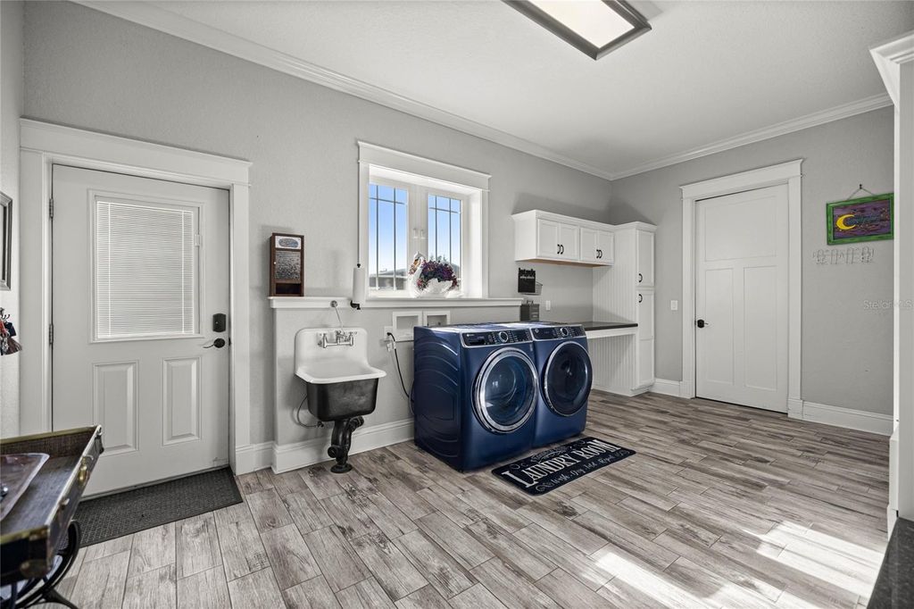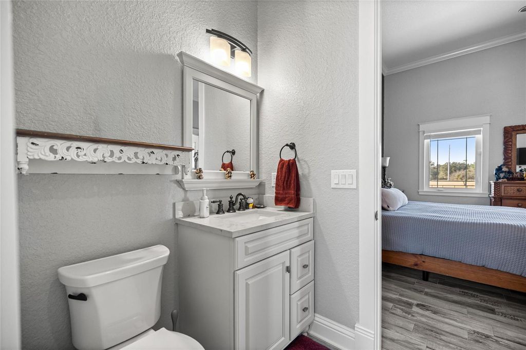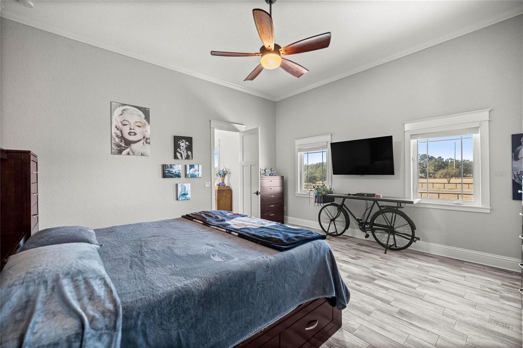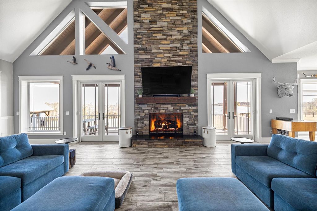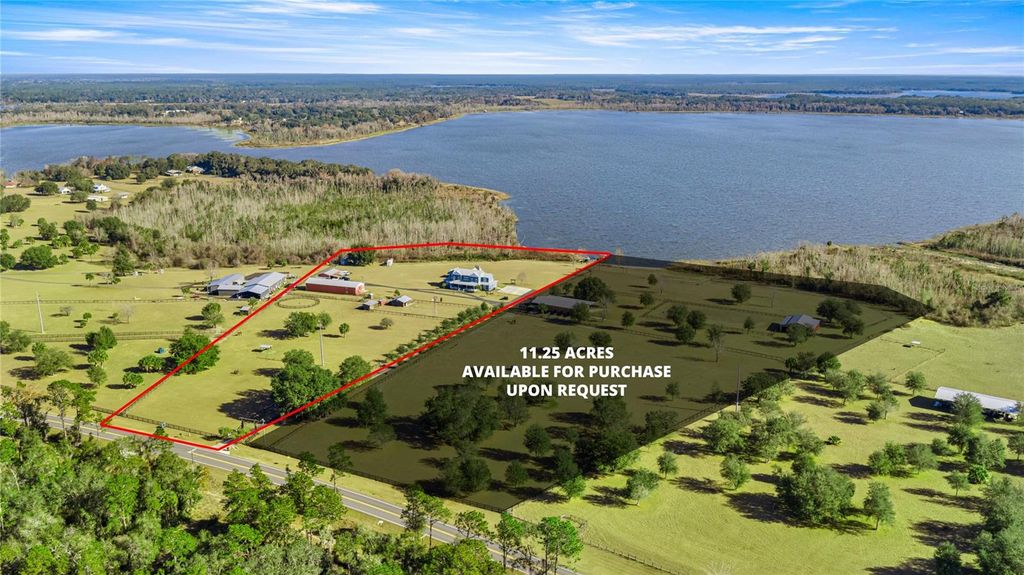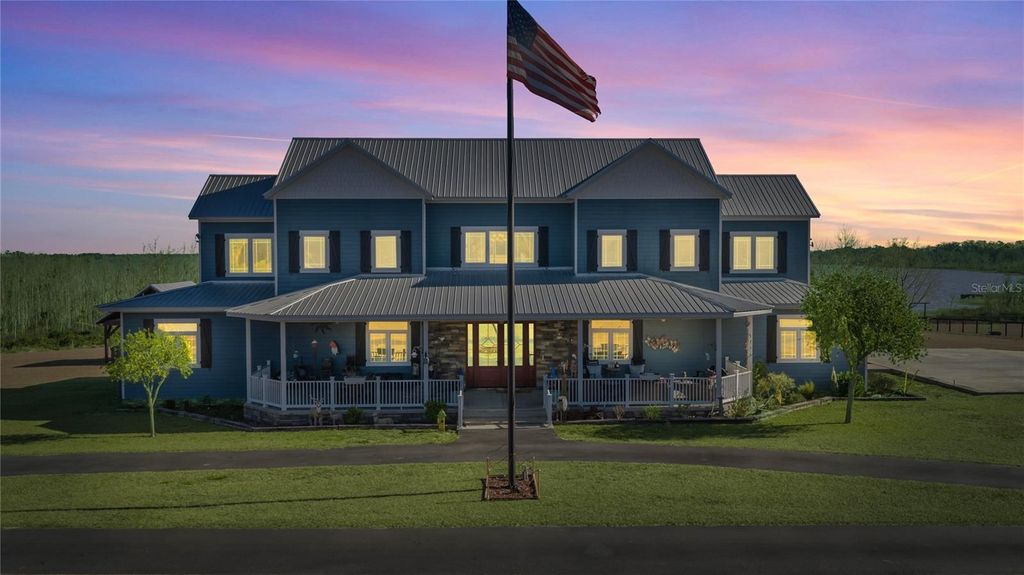 Experience extraordinary lakefront living in this breathtaking waterfront farmhouse estate set on 8.71 acres beneath a canopy of mature oaks. Offering over 5,500 square feet in the main residence plus a detached two-story guest apartment, this private compound blends upscale design, resort-style amenities, and wide-open acreage"”perfect for multi-generational living and entertaining.The striking exterior showcases a classic metal roof, crisp coastal-inspired façade, and deep wraparound porches with panoramic water views. Inside, soaring ceilings, wood-look tile flooring, and sun-filled spaces create an inviting yet dramatic atmosphere. The great room opens seamlessly to the chef's kitchen featuring custom cabinetry, granite countertops, a large center island with farmhouse sink, gas cooktop, double ovens, bar seating, and a massive walk-in pantry. Oversized dining windows frame picturesque lake views.The main home offers four bedrooms and four and half baths, including two owner's suites. The primary suite on the main level overlooks the lake and features a spa-inspired bath with clawfoot soaking tub, dual rain showers, double vanities, and an expansive walk-in closet. A private office with French doors and built-ins, a dedicated movie room, and an oversized laundry room with Murphy bed, utility sink, and abundant storage enhance everyday functionality.Upstairs, a loft overlooks the main living area and entryway, flanked by two bedrooms"”one with an oversized bath and walk-in closet, and another with a private bath and adjoining game room.Outdoor living is exceptional with a lakeside pavilion offering a hot tub, outdoor kitchen, with butcher block counter tops, gas grill, wood-burning fireplace, and TV. Enjoy your private sandy beach and dock with gazebo"”ideal for boating, fishing, or sunset relaxation.Equestrian amenities include a two-stall barn with wash rack, feed and hay storage building, two-stall lean-to, round pen, and expansive fenced pasture. Car enthusiasts will love the five-bay garage with a two-bedroom, 1.5-bath apartment, plus an additional three-bay garage providing incredible storage and flexibility.A rare opportunity to own a secluded lakefront retreat that seamlessly combines luxury living, equestrian facilities, resort-style outdoor spaces, and wide-open acreage.