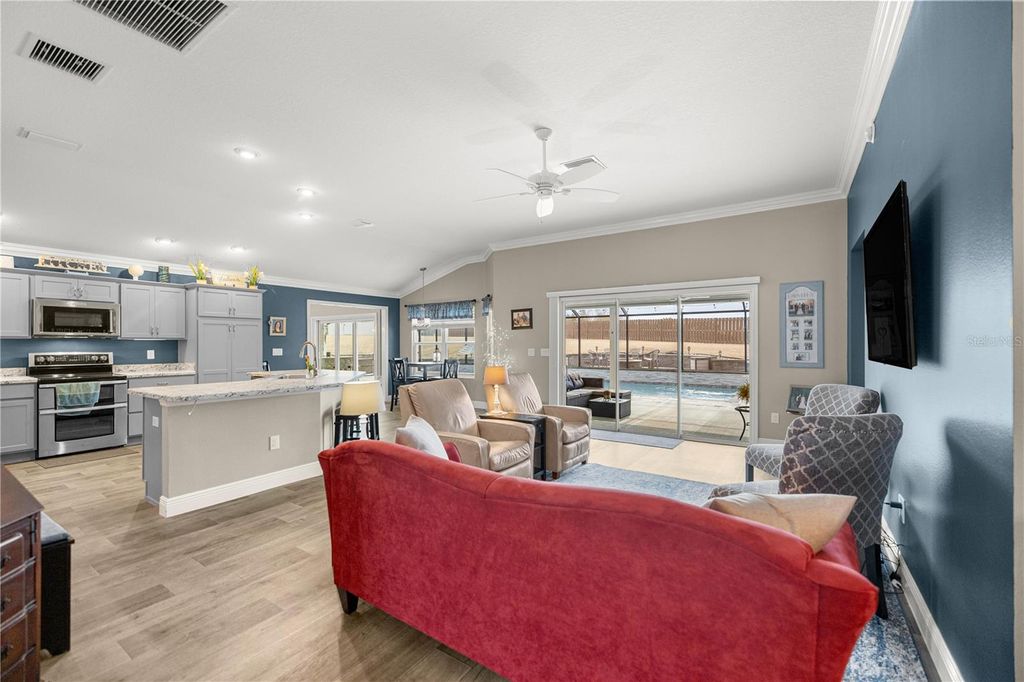 Welcome to elevated resort-style living in highly sought-after Oxford Oaks. This extensively upgraded residence showcases a breathtaking 16x40 saltwater pool with sun shelf and dual waterfalls, surrounded by 1,600 sq ft of elegant paver decking. The expansive 11x57 covered lanai features a custom U-shaped summer kitchen and elevated firepit "” creating a seamless indoor-outdoor entertaining experience. Inside, thoughtful enhancements continue with a dedicated pool bath, climate-controlled storage, and a spacious 20x30 media room complete with granite service bar and Mitsubishi ceiling cassette system. Additional upgrades include a full bath addition, expanded laundry with pantry, flexible bedroom configuration, and an enlarged fourth bedroom. Ideally positioned near The Villages, premier shopping, dining, and medical facilities, this home offers the perfect balance of privacy, luxury, and exceptional entertaining space.