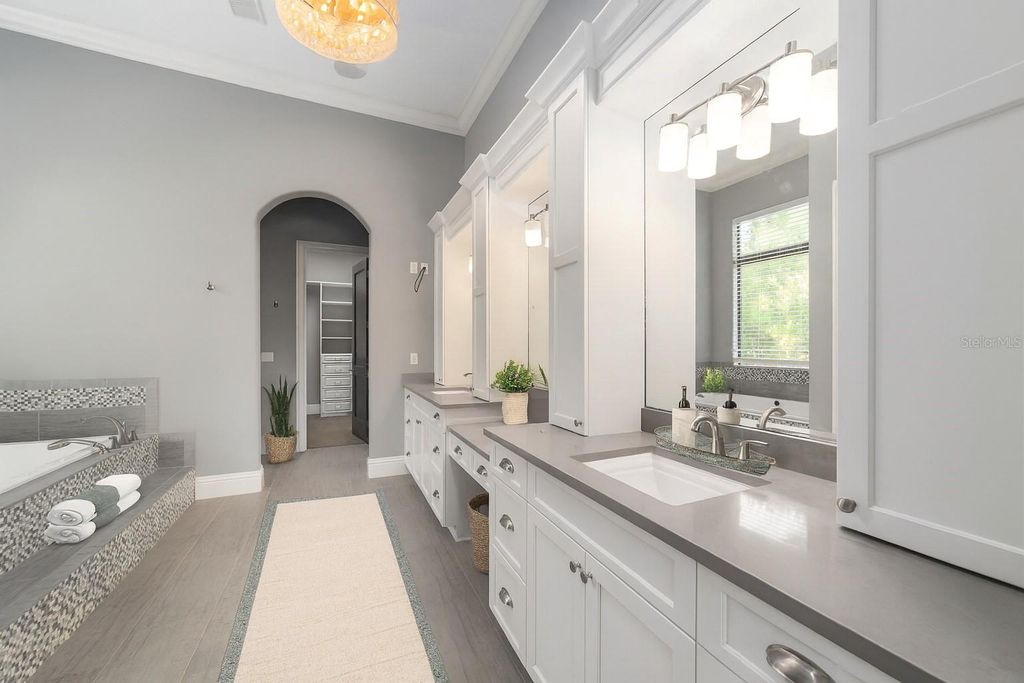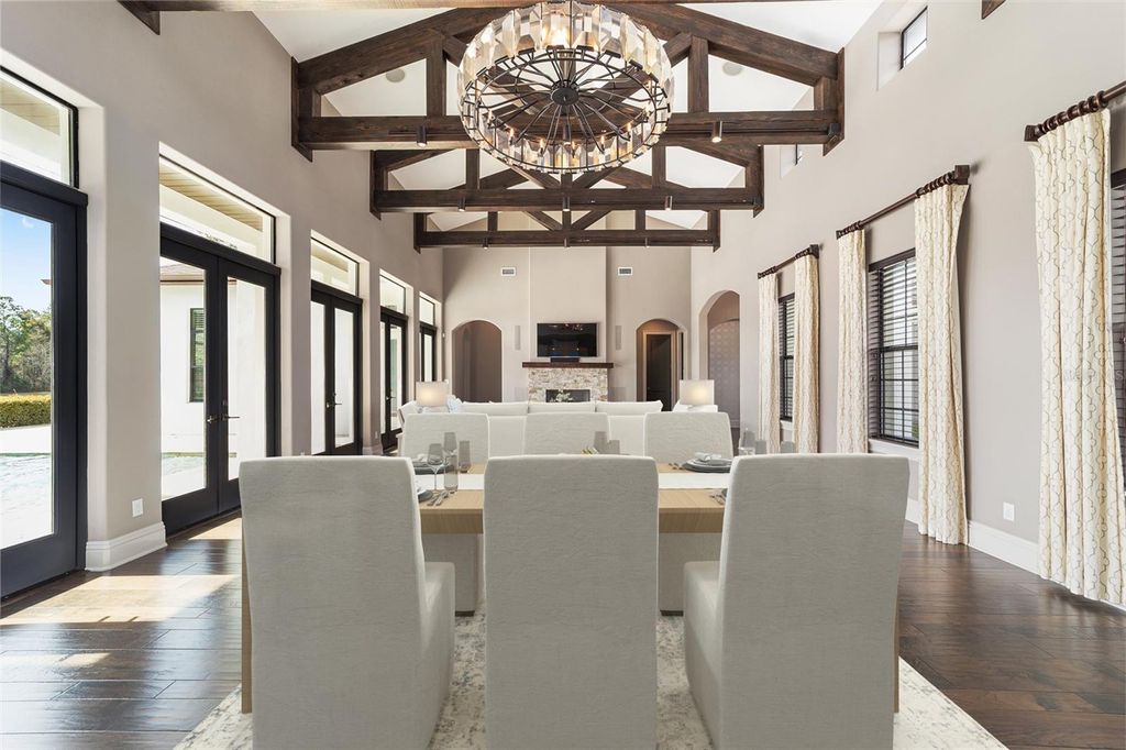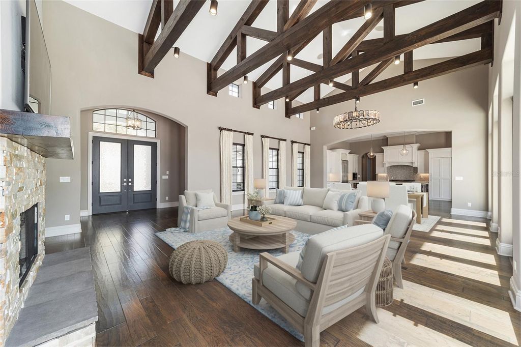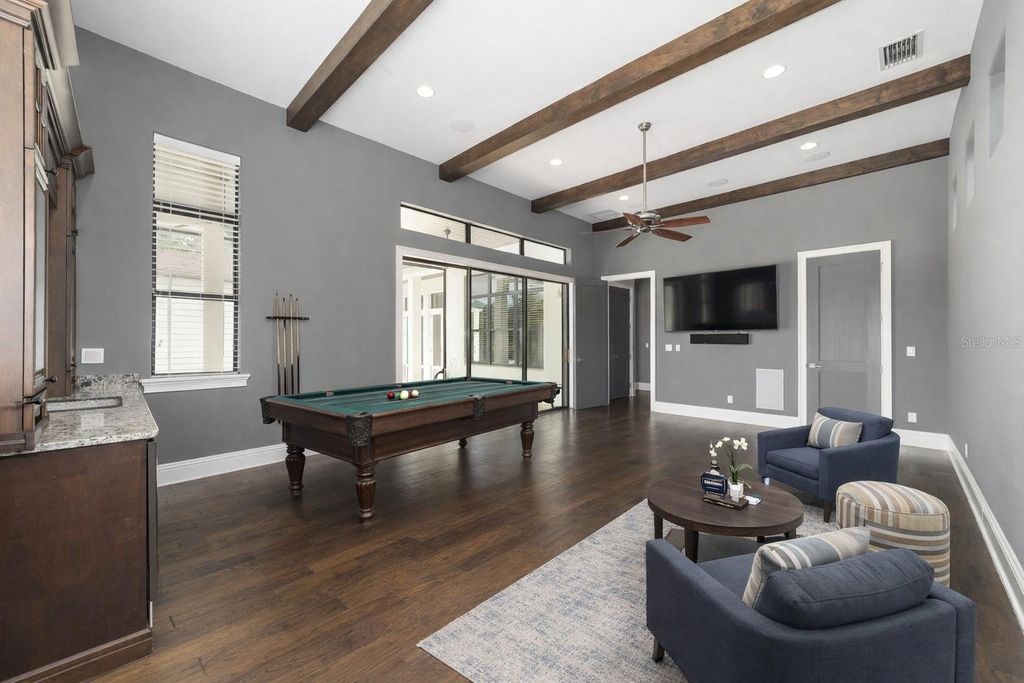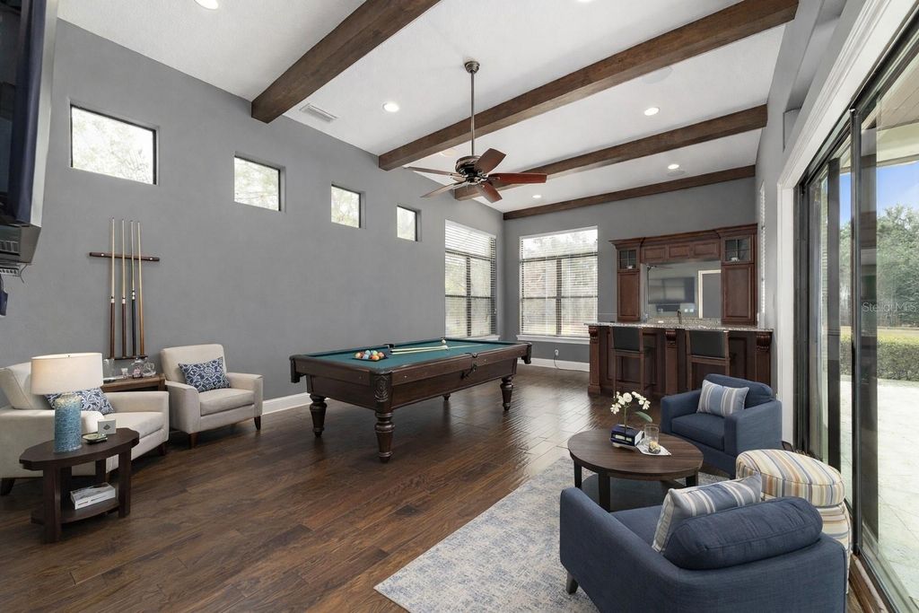 One or more photo(s) has been virtually staged. Experience refined living in this executive 4 Bedroom/6 Bath pool home, with million-dollar private nature views in the exclusive, centrally located Cedars of Bellechase community. Perfectly positioned along the oak-canopied 475 corridor, Bellechase offers unmatched privacy while being just minutes from major hospitals, shopping, dining, and more. This stunning Irvin custom-built smart home offers an impressive great room featuring dramatic 14' vaulted ceilings with exposed wood beams, rich hardwood floors, and a full wall of glass overlooking a resort-style pool area and private wooded views. Abundant natural light and refined architectural details, including an RH chandelier, make this space ideal for upscale living and effortless entertaining. A stone fireplace creates a striking focal point, while the open layout flows seamlessly into the designer kitchen with elegant finishes. The beautifully designed kitchen combines modern elegance with high-end functionality, showcasing sleek quartz countertops and a striking 9-foot island that offers generous prep space and casual seating. The double-oven gas range serves as a true chef's centerpiece, framed by crisp white high-end cabinetry and a stylish geometric tile backsplash. The adjoining breakfast room opens directly to the pool area which delivers upscale elegance featuring a sleek, modern pool accented by a raised spa wrapped in shimmering mosaic tile. Sealed and polished travertine stone decking offers multiple zones for sunbathing, lounging, and entertaining while overlooking serene nature views. The covered lanai extends the home's outdoor living with a double-sided fireplace topped with a mounted TV and electronic shades, creating a year-round retreat for relaxation. An outdoor kitchen (2021) featuring a built-in grill, sink, and generous counter space set in stone finishes overlooks a fire pit patio, creating an ideal spot for cooking and gathering. A convenient pool bath and powder room open directly to the pool area and spa, recently refreshed with a $10,000 renovation. This is more than a backyard; it's a private luxury escape designed for elevated living and unforgettable gatherings. Inside, an expansive 26-foot owner's suite features a crown molding-enhanced double tray ceiling, multiple windows, and a designated sitting area that creates a true private retreat. The en-suite bath offers a spa-like feel with a spacious walk-in shower that showcases dual showerheads, multiple body sprays, designer tile accents, and a separate soaking tub with a designer tile surround. An expansive double-sink vanity provides plenty of storage and style, and an arched entry leads into the custom-outfitted walk-in closet for added convenience. Three private guest suites and five bathrooms, rare in a home of this size, provide exceptional comfort for family and visitors, and an entertainment room with an upgraded built-in sound system and sliders opening to the pool area creates the perfect setting for fun. A split-garage design adds even more versatility, with the study offering private entry through a coded door into its own dedicated garage. Both garages are equipped with A/C mini-splits, ideal for an exercise room, workshop, or hobby space. The property also features a roof with approximately 10 years of remaining life, over $15k in premium landscape lighting, bronze smart landscape lighting installed in 2025, and Crestron-ready smart-home upgrades that elevate everyday comfort and control.