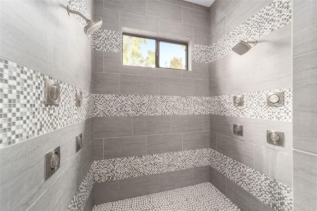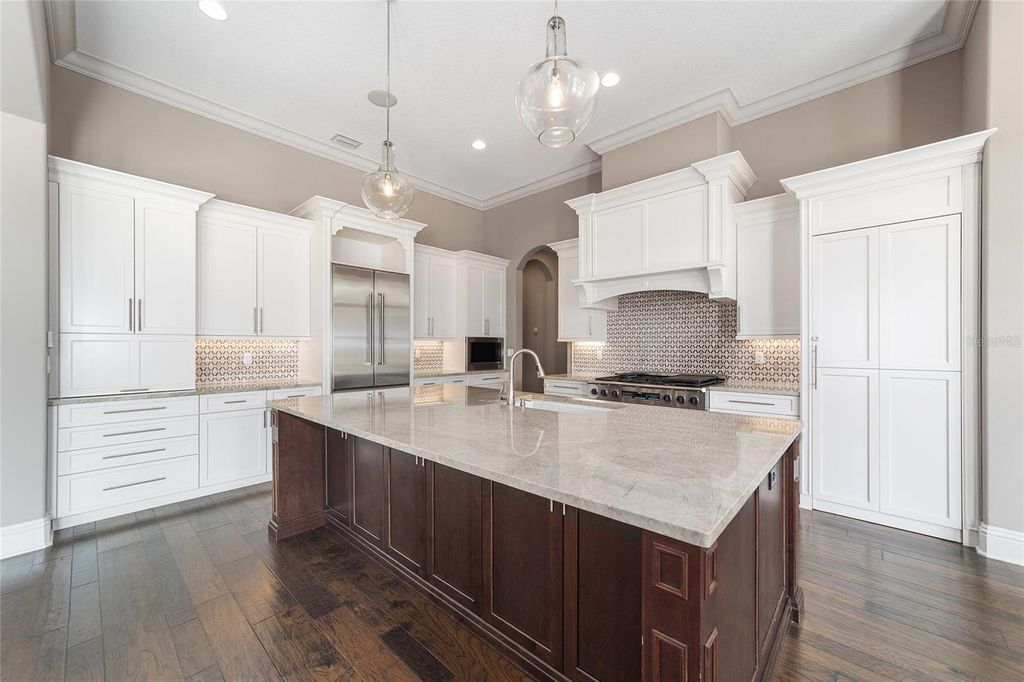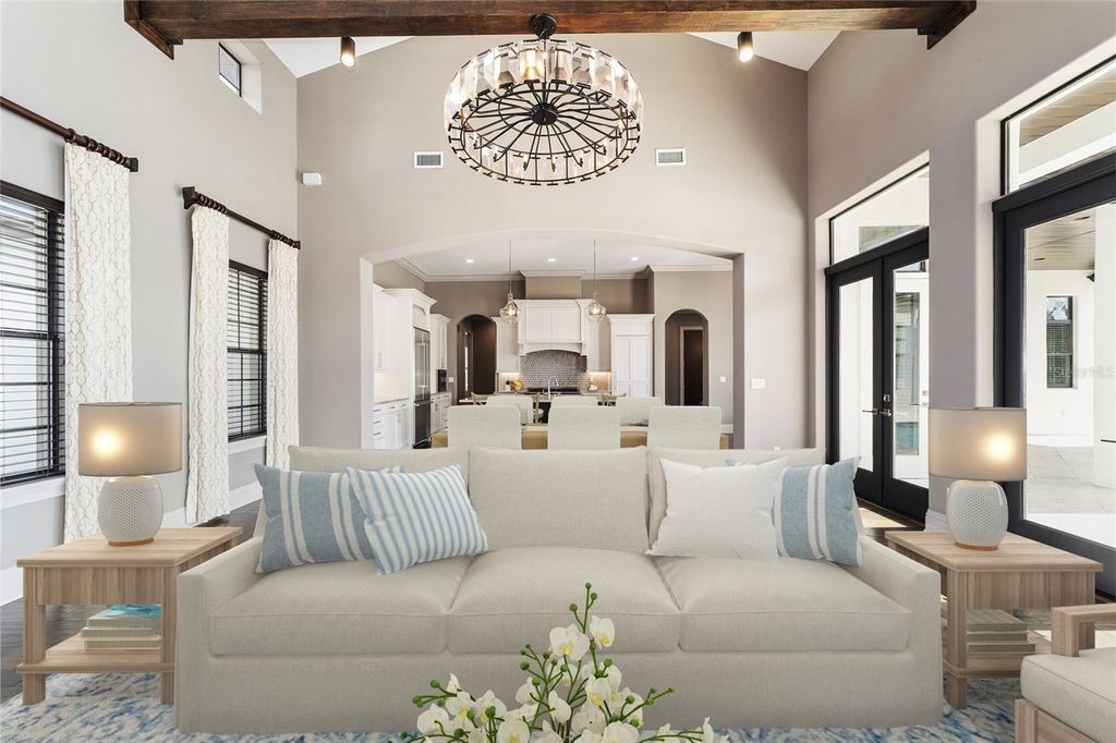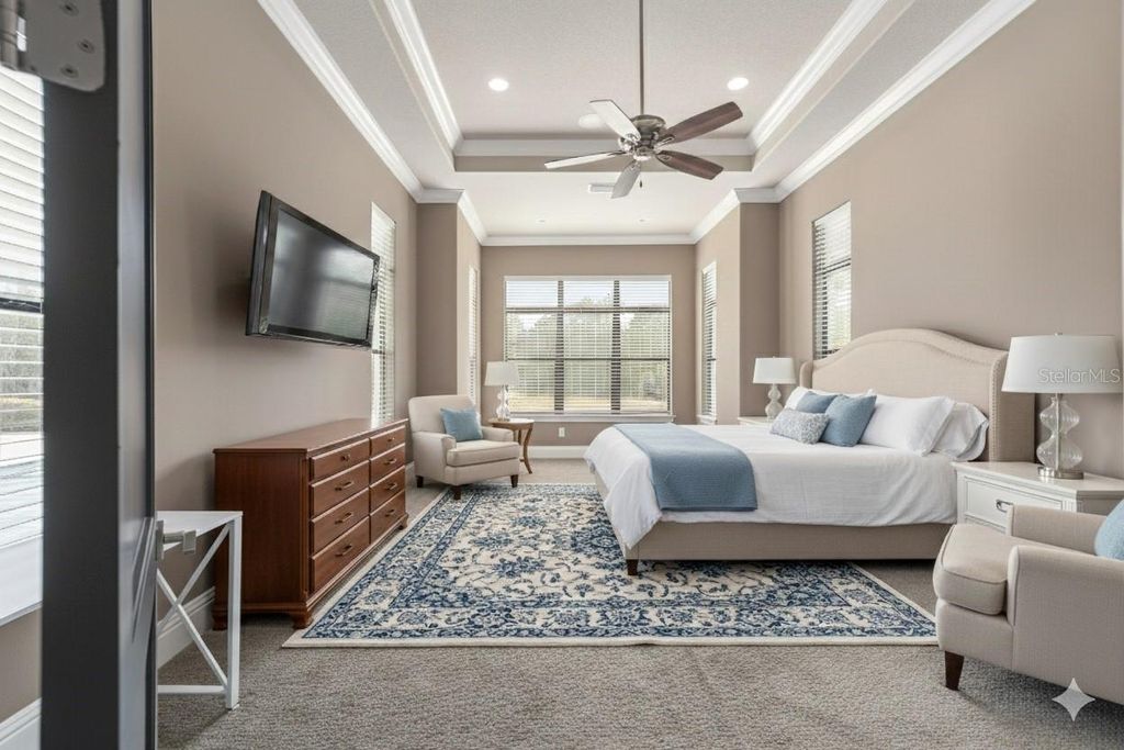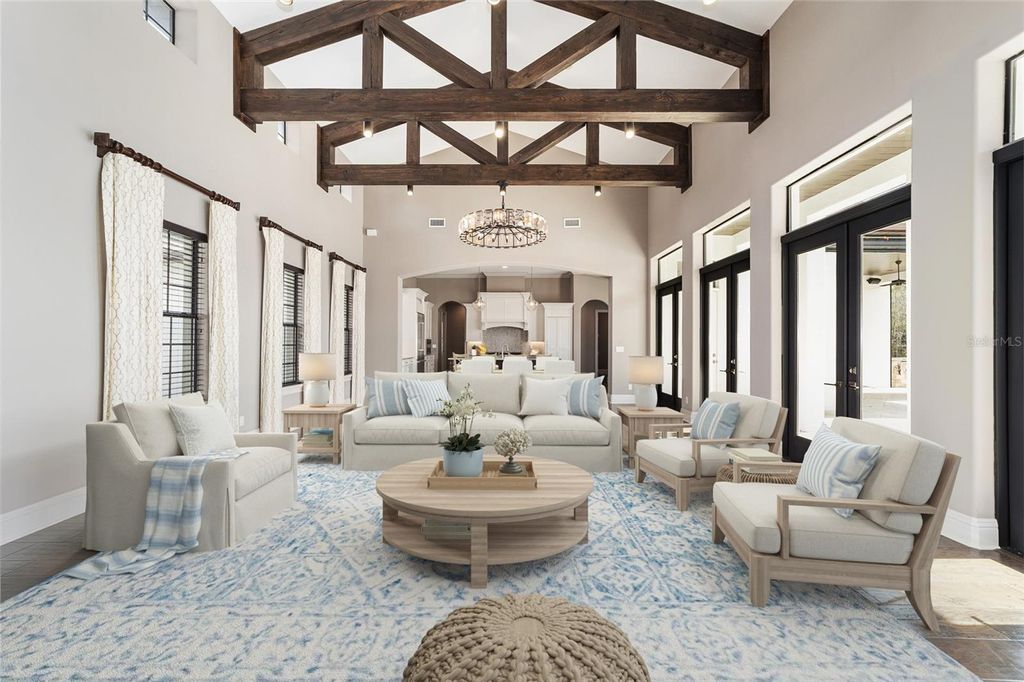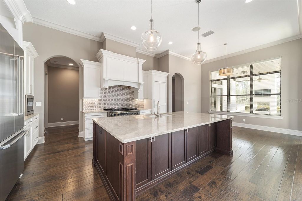 One or more photo(s) has been virtually staged. Experience refined living in this executive 4 Bedroom/6 Bath pool home, with million-dollar private nature views in the exclusive, centrally located Cedars of Bellechase community. Perfectly positioned along the oak-canopied 475 corridor, Bellechase offers unmatched privacy while being just minutes from major hospitals, shopping, dining, and more. This stunning Irvin custom-built smart home offers an impressive great room featuring dramatic 14' vaulted ceilings with exposed wood beams, rich hardwood floors, and a full wall of glass overlooking a resort-style pool area and private wooded views. Abundant natural light and refined architectural details, including an RH chandelier, make this space ideal for upscale living and effortless entertaining. A stone fireplace creates a striking focal point, while the open layout flows seamlessly into the designer kitchen with elegant finishes. The beautifully designed kitchen combines modern elegance with high-end functionality, showcasing sleek quartz countertops and a striking 9-foot island that offers generous prep space and casual seating. The double-oven gas range serves as a true chef's centerpiece, framed by crisp white high-end cabinetry and a stylish geometric tile backsplash. The adjoining breakfast room opens directly to the pool area which delivers upscale elegance featuring a sleek, modern pool accented by a raised spa wrapped in shimmering mosaic tile. Sealed and polished travertine stone decking offers multiple zones for sunbathing, lounging, and entertaining while overlooking serene nature views. The covered lanai extends the home's outdoor living with a double-sided fireplace topped with a mounted TV and electronic shades, creating a year-round retreat for relaxation. An outdoor kitchen (2021) featuring a built-in grill, sink, and generous counter space set in stone finishes overlooks a fire pit patio, creating an ideal spot for cooking and gathering. A convenient pool bath and powder room open directly to the pool area and spa, recently refreshed with a $10,000 renovation. This is more than a backyard; it's a private luxury escape designed for elevated living and unforgettable gatherings. Inside, an expansive 26-foot owner's suite features a crown molding-enhanced double tray ceiling, multiple windows, and a designated sitting area that creates a true private retreat. The en-suite bath offers a spa-like feel with a spacious walk-in shower that showcases dual showerheads, multiple body sprays, designer tile accents, and a separate soaking tub with a designer tile surround. An expansive double-sink vanity provides plenty of storage and style, and an arched entry leads into the custom-outfitted walk-in closet for added convenience. Three private guest suites and five bathrooms, rare in a home of this size, provide exceptional comfort for family and visitors, and an entertainment room with an upgraded built-in sound system and sliders opening to the pool area creates the perfect setting for fun. A split-garage design adds even more versatility, with the study offering private entry through a coded door into its own dedicated garage. Both garages are equipped with A/C mini-splits, ideal for an exercise room, workshop, or hobby space. The property also features a roof with approximately 10 years of remaining life, over $15k in premium landscape lighting, bronze smart landscape lighting installed in 2025, and Crestron-ready smart-home upgrades that elevate everyday comfort and control.