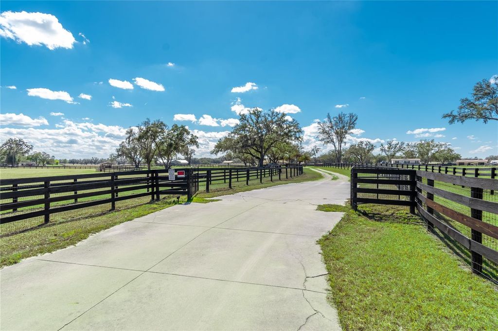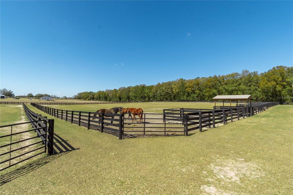 Set on 27 acres of gently rolling land in Marion County's sought-after horse country, this well-equipped equestrian property is designed for training, conditioning, and daily operations. Ideally located just 12 minutes from HITS and 20 minutes to the World Equestrian Center (WEC), it offers convenient access to Ocala's premier competition venues. The farm is fully fenced and gated with new board and cross fencing, with a long private drive leading through multiple paddocks and established pastures shaded by mature oaks. The layout supports efficient movement of horses and equipment while maintaining a clean, organized setting. Two residences are in place to support farm operations, including a 3-bedroom, 2-bath main home (approx. 2,410 sq ft) and a newer 3-bedroom, 2-bath mobile home (2023), ideal for staff housing, trainers, or seasonal use. The main home features vaulted ceilings, a split-bedroom plan, tile flooring throughout the main living areas, and a screened porch overlooking the farm. Equine improvements are thoughtfully designed for functionality and horse care. The property includes five 16x16 stalls configured as individual run-in style barns, each with water access and secure gating, along with multiple paddocks equipped with water and misting systems. Additional infrastructure includes catch pens, run-in sheds, and a concrete barn with a designated treatment/veterinary area featuring hot and cold water, sink, electric, lighting, and fans. A round pen is in place for daily training, with ample open acreage available for expansion, including the potential for a full arena or additional barn structures. Feed and hay storage are conveniently located within a covered structure adjacent to the work area. The workshop/garage is a substantial multi-bay building with roll-up doors, ideal for equipment storage and maintenance, and is equipped with electric (220 amp), water, and ventilation. With a practical layout, solid infrastructure, and room to expand, this property is well-suited for a professional training, lay-up, or small-scale boarding operation, all within close proximity to Ocala's major equestrian hubs.