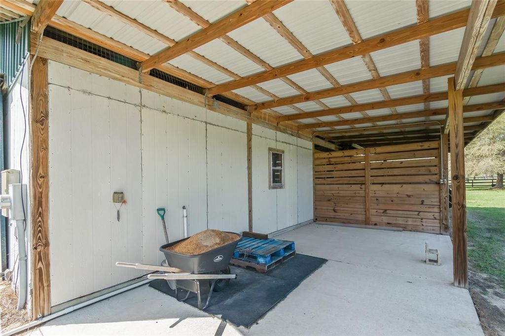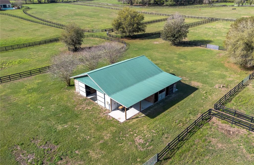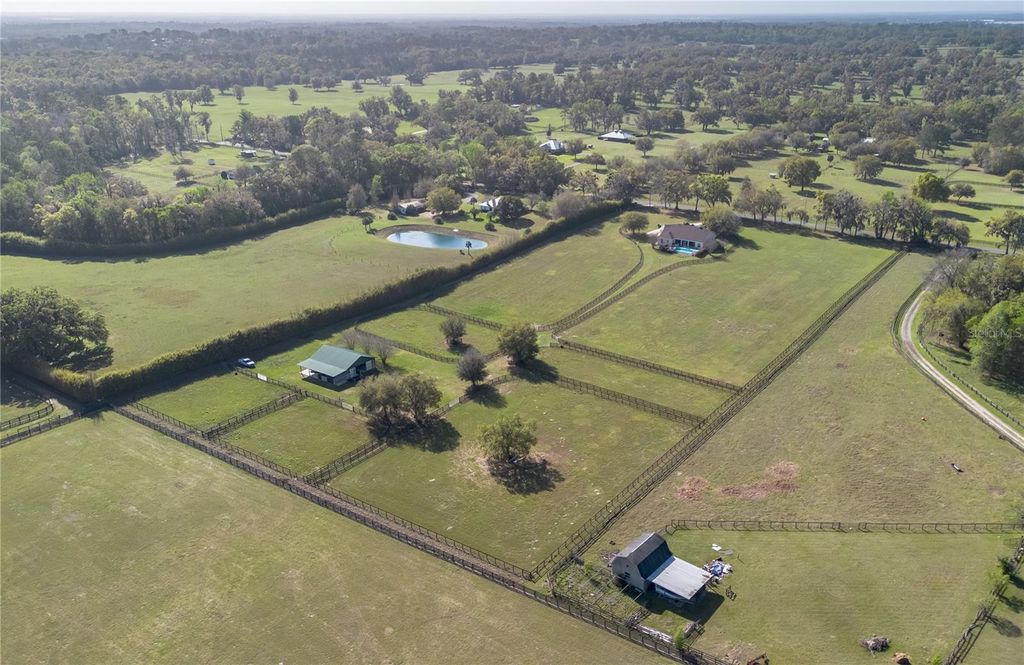 Nestled at the heart of NW Ocala's vibrant horse country, this well-appointed horse farm is set on just over 10-acres of gently rolling land within the equestrian neighborhood of Golden Farms. Fenced and gated, the property features a line of trees along the front perimeter for added privacy. Down a curved driveway towards the front of the property is the inviting 3-bedroom, 2-bath home accented by mature landscaping, a spacious covered country-style front patio with ceiling fans, and side-entry 2-car garage. Inside, the home is light and bright with an open, split-bedroom floor plan, high ceilings with tray accents, bamboo flooring that runs throughout the main spaces. The living room features a lovely Eilete NexGen Hybrid Fireplace, a clean-burning wood fireplace that creates an inviting atmosphere. Those who enjoy cooking will love the well-appointed kitchen, which features abundant cabinet and counter space, stainless steel appliances, gas range, and a large breakfast bar- all positioned to flow easily into dining and living areas, ideal for both everyday living and entertaining. The split-bedroom layout ensures privacy throughout, with a spacious primary suite that includes a large walk-in closet and a private en-suite bath with a built-in vanity, garden tub, and glass-door shower. Outside, the screen-enclosed patio overlooks the private infinity-edge pool and spa, designed to capture expansive views of the surrounding pasture. This outdoor space is perfectly suited for relaxing or entertaining while enjoying the peaceful setting year-round. Equestrian amenities are thoughtfully laid out throughout the property, including an 8-stall center-aisle barn with feed room, tack room, wash rack, hot water, and a fly spray system. A total of 7 paddocks are established with 3-board fencing and no-climb wire, offering flexibility for turnout and training. Ideally located just 10 minutes from the World Equestrian Center (WEC) and 13 minutes from HITS, this farm is perfect for those looking to take get the most out of some of the area's most exciting competition venues and still be nearby a variety of tack and feed stores, equestrian service providers, and world-class veterinary care. This property offers a rare opportunity to enjoy space, privacy, and a well-equipped farm layout ready to support a variety of disciplines- schedule your showing today!
