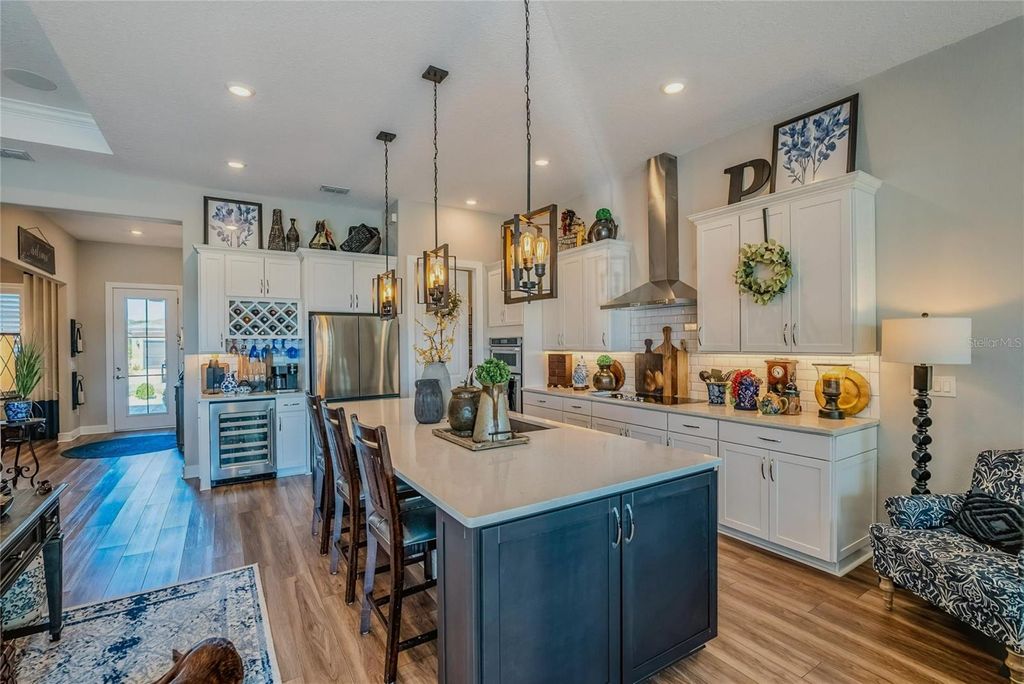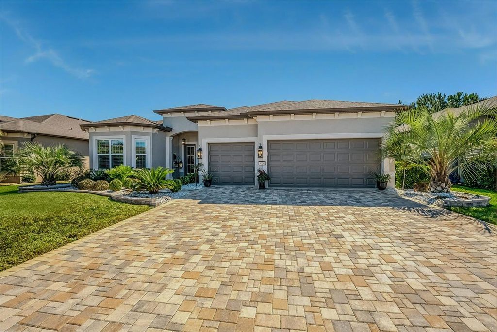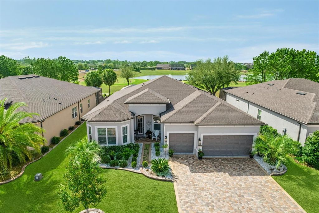 It's time to embrace retirement in true luxury in this exceptional Stellar model pool home, perfectly positioned with sweeping views of the golf course and tranquil lake in Del Webb Stone Creek. Here, every day feels like a private retreat, where peaceful water vistas and breathtaking sunsets over the fairways become part of your everyday lifestyle. Designed for both elegance and comfort, this 3-bedroom, 3-bathroom residence offers luxury vinyl flooring throughout, with tile in the bathrooms and laundry room for added durability. A glass inset front door welcomes you inside, where tray ceilings in the living room and primary bedroom, added recessed lighting, and designer touches like an accent wall in the living room and shiplap feature wall in the bedroom create warmth and sophistication. At the heart of the home, the gourmet kitchen is a true showpiece, featuring quartz countertops, stainless steel appliances, pendant lighting, soft-close cabinetry with crown molding, and a built-in dry bar perfect for entertaining. Zero-corner sliders open completely to the screened lanai, seamlessly blending indoor and outdoor living. Step outside to your private oasis "” a sparkling pool with screen enclosure, outdoor kitchen, and sunshade for added privacy, all overlooking the stunning golf and lake views. Whether hosting friends or enjoying a quiet morning coffee, this space is designed to impress. The primary suite offers a spa-inspired retreat with a zero-entry walk-in shower, while the second and third bathrooms feature beautifully tiled showers. Additional highlights include an extended 3-car garage, a convenient drop zone off the garage, laundry room with cabinets and utility sink, water softener system, plantation shutters, Cheyenne interior doors, paver driveway and entry, and custom landscaping that completes the home's exceptional curb appeal. This is more than a home "” it's the elevated, resort-style lifestyle you've been waiting for.