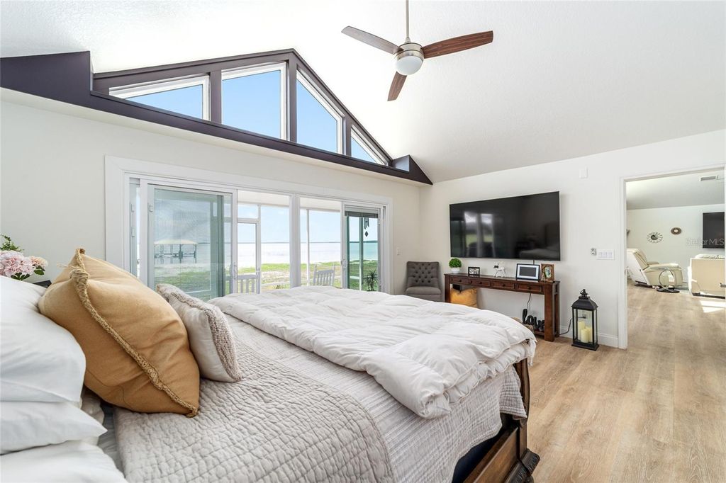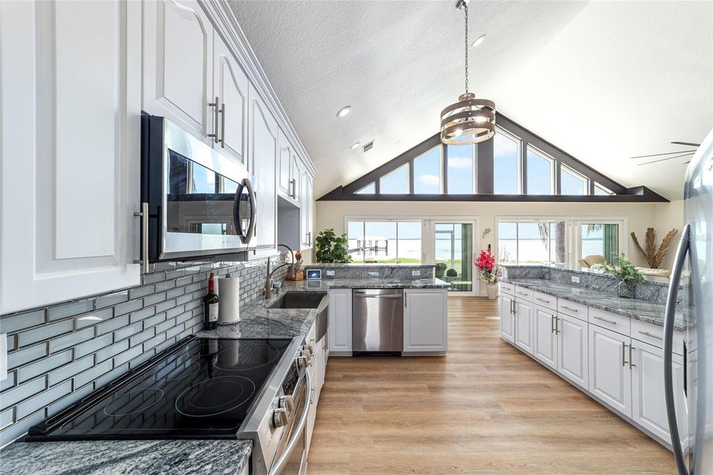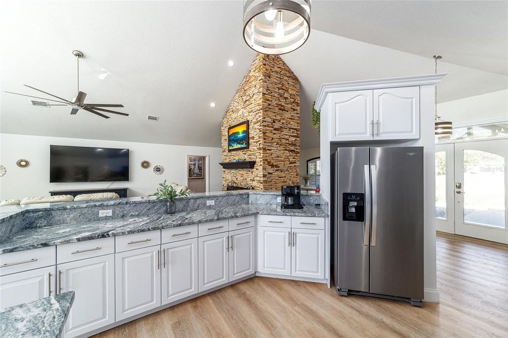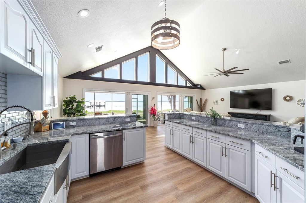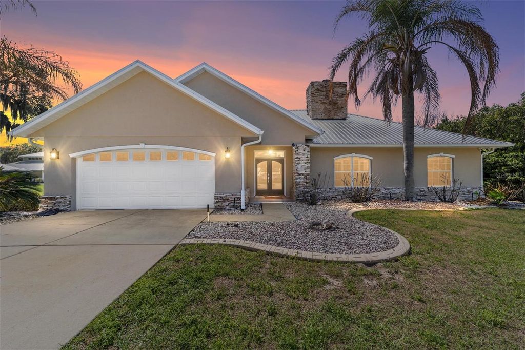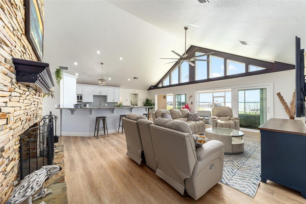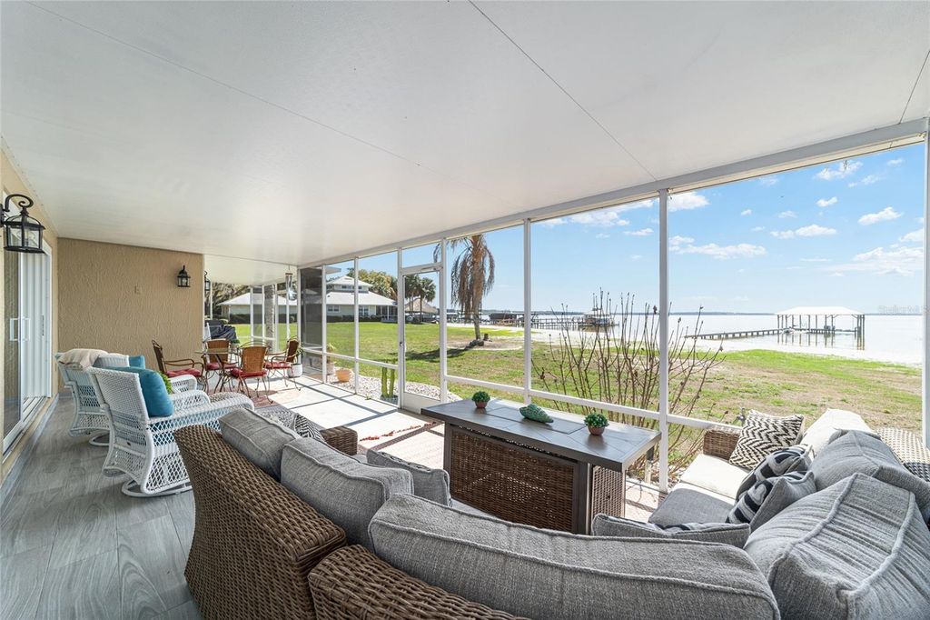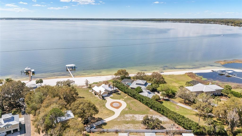 Sunsets abound. Along the shoreline of Lake Weir in the Sandy Hook area, this lakefront residence offers 200 feet of sandy shoreline, expansive outdoor space and direct access to one of Central Florida's established recreational lakes. On just over two acres, the property provides privacy, flexibility for outdoor improvements and unobstructed water views. The home faces west across the lake, offering sunset views over the water. The 2,204-square-foot residence includes three bedrooms and two baths with a split floor plan designed for entertaining and everyday living. An open kitchen connects to the main living and family areas, anchored by a double-sided fireplace that links the interior gathering spaces. Large windows and primary living areas frame views of the lake and surrounding landscape. The primary suite includes a walk-in closet and bath with a walk-in shower, garden tub and dual vanities. Two additional bedrooms and a full bath are positioned on opposite side of the residence, providing separation for guests or family members. Additional improvements include a 40-by-36-foot detached building, suitable for equipment storage, workshop space or hobby use, providing flexibility for tools, lake gear or recreational equipment. Outdoor living centers around the lakefront setting. A private dock extends into Lake Weir, providing access for boating, fishing and waterfront recreation. The property's sandy shoreline and open lake frontage create space for lakeside seating, swimming and water activities. Lake Weir spans approximately 5,600 acres and is known for boating, fishing and swimming. The Sandy Hook area features established homesites and a lakefront setting. The property is also within convenient driving distance of The Villages and Ocala, providing access to shopping, dining, medical services and year-round entertainment.