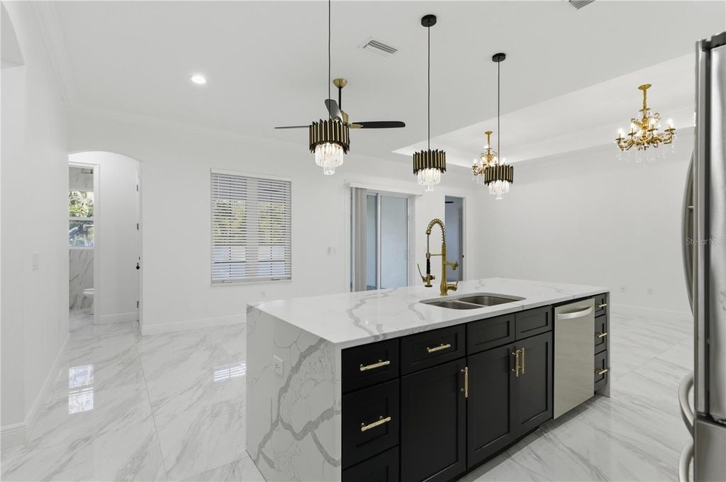 Beautiful like-new home featuring 5 bedrooms and 4 bathrooms, thoughtfully designed with comfort, space, and modern style in mind. The open-concept layout offers a bright and welcoming feel, highlighted by a stunning kitchen with quartz countertops, custom cabinetry, a large waterfall island, and elegant gold accents throughout. The home also includes a private office with glass French doors and large windows, perfect for working from home or creating a quiet, light-filled space. The primary suite is spacious and inviting, featuring tray ceilings and plenty of natural light. The primary bathroom offers a spa-like experience with a freestanding soaking tub, a large walk-in shower with floor-to-ceiling tile and rainfall shower system, and a functional layout with dual vanity areas and direct access to a walk-in closet. All bathrooms in the home are finished with modern tile, upgraded vanities, and coordinated fixtures, creating a clean and consistent design throughout. Enjoy the covered lanai, ideal for relaxing or entertaining, along with a fully fenced backyard that provides privacy and plenty of space to enjoy the outdoors. Located in a growing area of Ocala, this home offers a perfect combination of modern finishes, functional layout, and everyday comfort. Conveniently located just minutes from I-75, with new Publix and Walmart developments currently underway along Hwy 484, adding to the area's continued growth and accessibility.