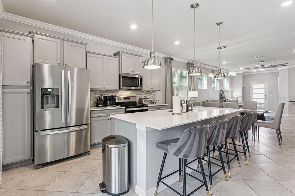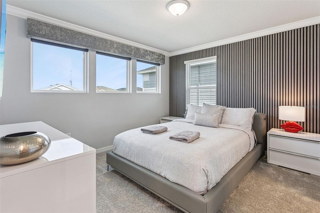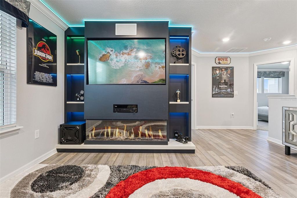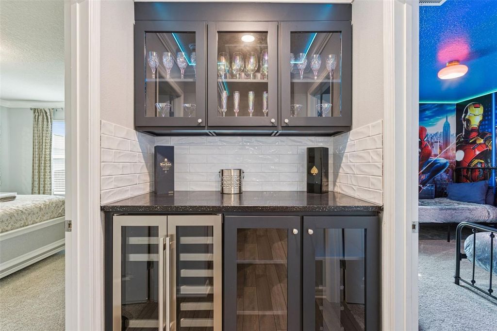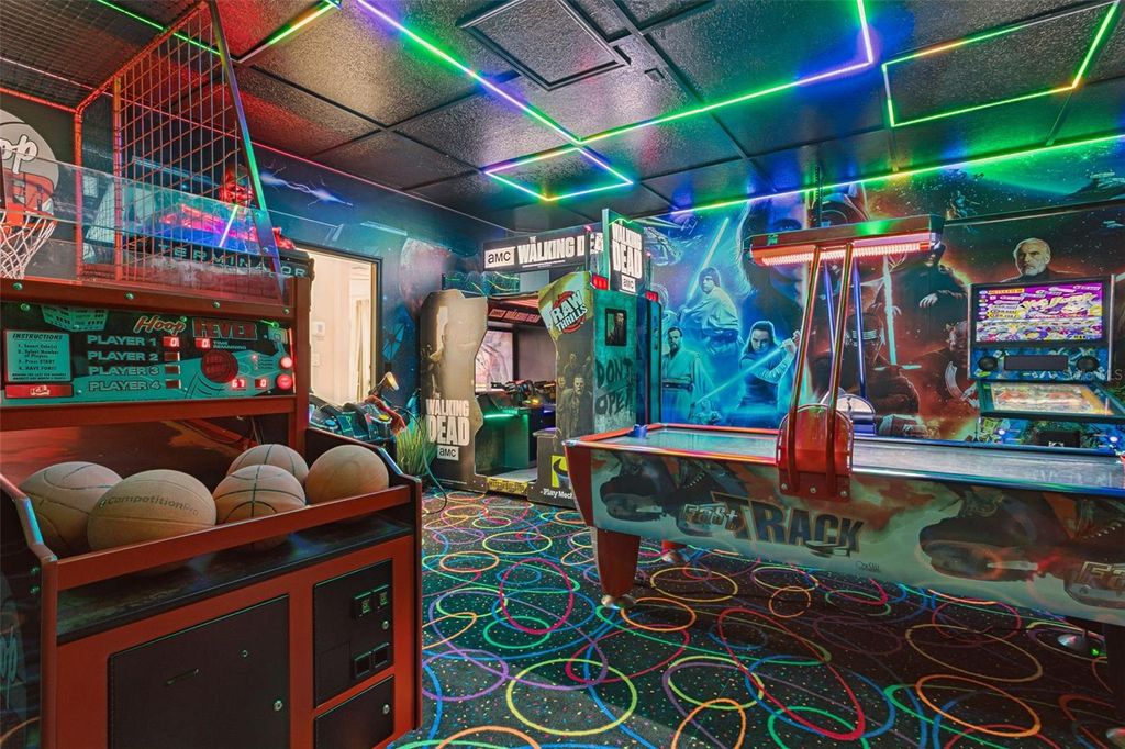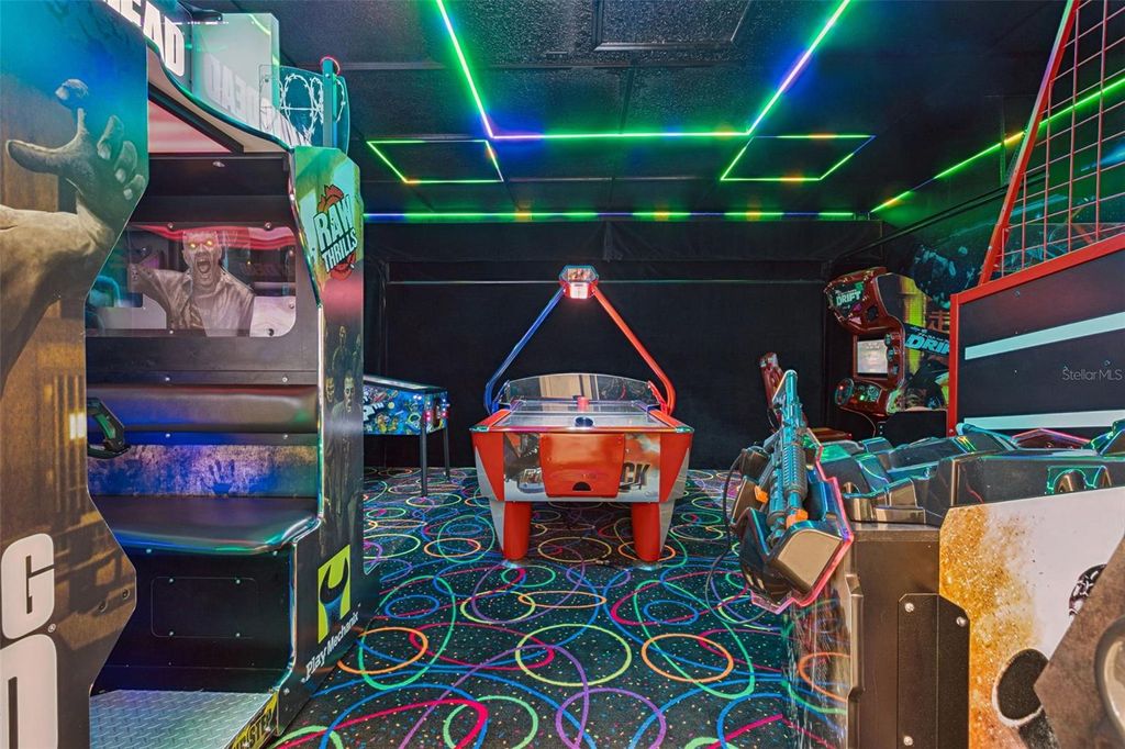 Florida Contemporary, beautifully decorated vacation home located in the desirable Windsor Cay Resort. From the moment you enter, you are welcomed into an open-concept living, dining, and kitchen space with expansive views of the private pool through oversized sliding glass doors. The screened outdoor living area is oversized and thoughtfully designed, with convenient access to a nearby half bath"”perfect for pool days without tracking through the home. Inside, the living room features a custom decorative accent wall with a 75-inch Samsung curved TV, built-in storage, and a cozy fireplace. The kitchen is fully equipped and ideally laid out for cooking and entertaining, complete with a generously sized pantry. The garage has been masterfully repurposed into a game room that is sure to provide hours of entertainment. The first floor also offers a spacious primary suite with sliding glass door access to the pool, along with a discreet yet easily accessible utility room. Upstairs, you'll find a meticulously decorated media room featuring a built-in TV, surround sound, and an electric fireplace. The adjacent dry bar, complete with wine refrigerator and LED lighting, sets the stage for unforgettable movie nights. Each of the four bedrooms upstairs is privately situated at its own corner of the home and includes an en-suite bathroom. Windsor Cay is one of Central Florida's premier short-term rental communities, offering a 24-hour staffed gated entrance and resort-style amenities including a zero-entry pool, water slides, lazy river, hot tub, poolside cabanas, fitness center, on-site dining, sundry marketplace, arcade, mini putt-putt golf, cornhole, sand volleyball court, and daily family activities. The owner spared no expense with upgrades and furnishings, making this property truly turnkey. As an active vacation rental, showings may require flexibility"”but once you experience the home, you'll quickly see it is well worth the wait. Ideally located near Central Florida's world-famous attractions: approximately 14 miles to Walt Disney World® Resort and Disney Springs®, 18 miles to SeaWorld®, 22 miles to Universal Studios®, and 30 miles to Orlando International Airport. HOA covers community amenities, along with yard, irrigation and trash.
