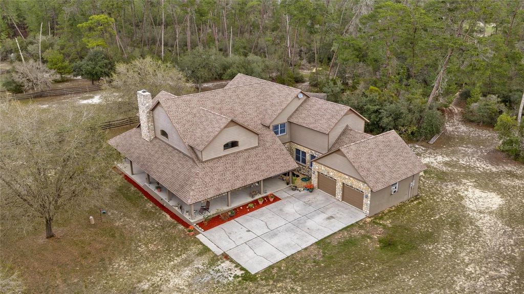 This distinguished 10-acre estate, situated at the end of your own private drive, features 3,910 square feet of living space. The interior is an open concept floor plan anchored by an impressive floor-to-ceiling stone fireplace serving as the centerpiece for the primary living area. The versatile floor plan includes 4 bedrooms and 2.5 bathrooms, supplemented by a professional executive office and a substantial bonus media/game room. Additionally, the home features an oversized laundry suite and a walk-in pantry. With the roof, HVAC systems, and water heater all being replaced in 2021, this home is well maintained and ready for you to make it your own. The exterior grounds are fenced and fully ready for equestrian or agricultural pursuits, featuring a professional-grade barn with integrated stables and an attached two-car garage. Additionally, the home features a wraparound porch, perfect for entertaining your friends and family. This property provides total privacy while maintaining close proximity to local municipal centers and the premium waterways of the Nature Coast. This is an exceptional opportunity for the high caliber buyer who sees the potential.