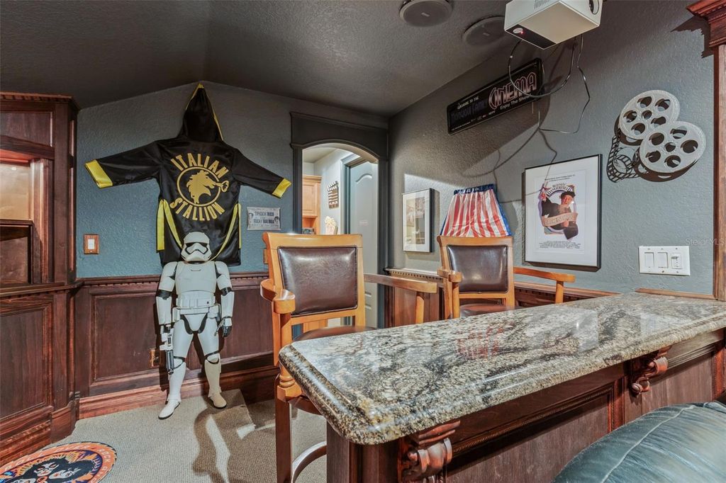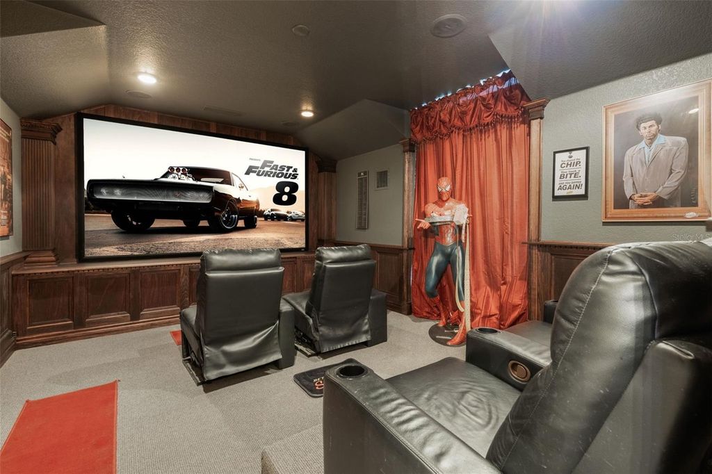 Welcome to this custom-built home that reflects exceptional craftsmanship and resort-style living, set within the gated golf community of RedTail. This thoughtfully designed residence showcases real hardwood flooring in formal areas, 8-foot interior doors, plantation shutters, and detailed solid wood trim and crown molding throughout, highlighting the quality of construction. Granite countertops are featured throughout the home. The kitchen is both functional and refined, showcasing 42-inch cabinetry, a large center island, stainless steel appliances, a natural stone backsplash, a walk-in pantry, and a separate wet coffee bar. A see-through gas fireplace connects the main living areas, adding warmth and architectural interest. The layout includes a dedicated office or bonus space with built-in shelving and desk, a private home theater. The primary suite serves as a spacious retreat, featuring 12-foot tray ceilings with his-and-hers walk-in closets. Outdoor living features a screened lagoon-style pool with full privacy and a well-equipped outdoor kitchen with granite countertops and a stainless-steel oven, ideal for entertaining. Mature landscaping creates a secluded and serene outdoor setting. RedTail offers championship golf, dining, fitness and spa amenities, Har-Tru clay tennis courts, scenic walking trails, and golf-cart-friendly streets, all conveniently located near downtown Orlando, major highways, and area attractions. Current Insurance $3,563, Taxes $7,706